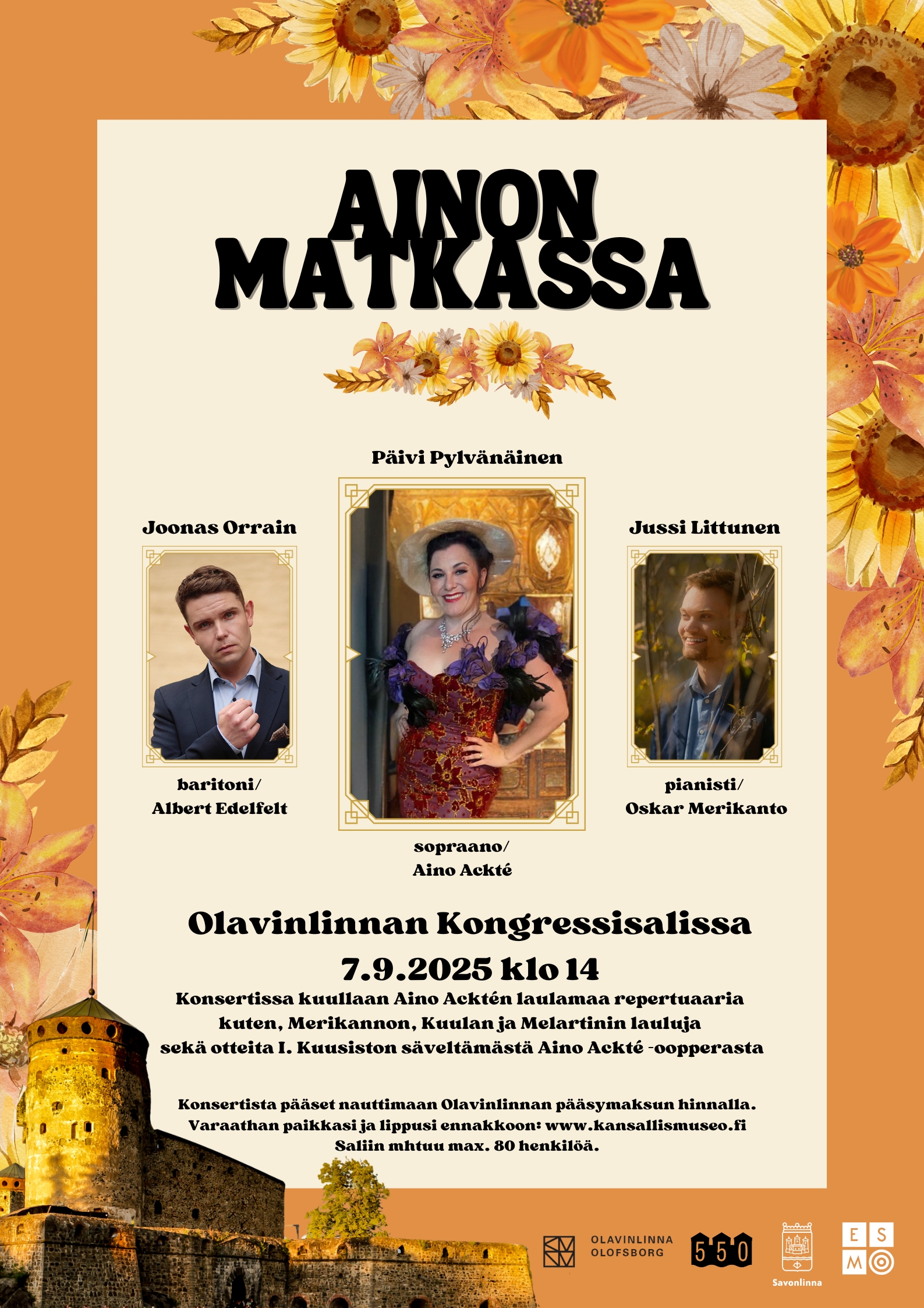 Esiintymässä on laaja joukko ESMO ry:n tuotannoista tuttuja taiteilijoita: Maiju Vaahtoluoto, Heikki Kilpeläinen, Päivi Pylvänäinen, Joonas Orrain, Anu Ontronen, Mari Karjalainen, Laura Heinonen, Maria Mentu, Saara Silvennoinen, Minna Raassina, Maija Teikari, Matti Makkonen, ESMO ensemble, Etelä-Savon maakuntakuoro, Savonlinna-kuoro.