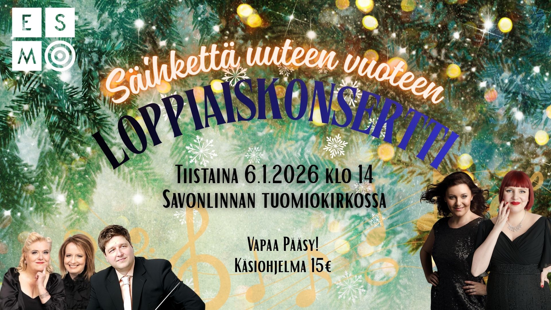 ESMO ry järjestää Savonlinnan tuomiokirkossa 6.1.2026 Loppiaiskonsertin, joka tarjoaa säihkettä uuteen vuoteen. Esiintymässä ovat savonlinnalaisille tutut muusikot Maiju Vaahtoluoto, mezzosopraano ja Päivi Pylvänäinen, sopraano sekä pianotriossa Susanna Mieskonen-Makkonen, viulu, Matti Makkonen, sello ja Maija Teikari, piano. Konserttiin on vapaa pääsy. Konsertin käsiohjelma maksaa 15€.